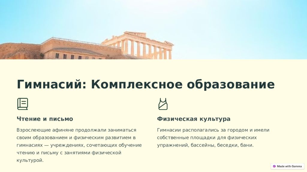 Гимнасий: Комплексное образование Чтение и письмо Взрослеющие афиняне продолжали заниматься своим образованием и физическим развитием в гимнасиях — учреждениях, сочетающих обучение чтению и письму с занятиями физической культурой. Физическая культура Гимнасии располагались за городом и имели собственные площадки для физических упражнений, бассейны, беседки, бани.
