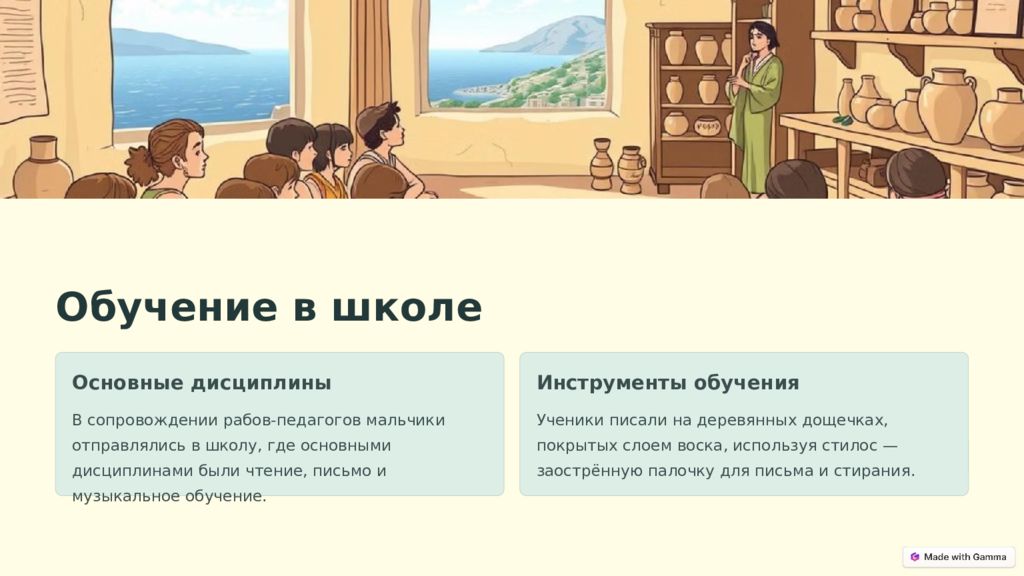 Обучение в школе Основные дисциплины В сопровождении рабов-педагогов мальчики отправлялись в школу, где основными дисциплинами были чтение, письмо и музыкальное обучение. Инструменты обучения Ученики писали на деревянных дощечках, покрытых слоем воска, используя стилос — заострённую палочку для письма и стирания.