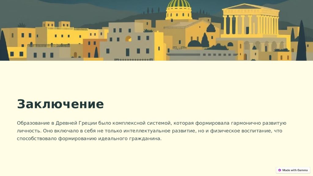 Заключение Образование в Древней Греции было комплексной системой, которая формировала гармонично развитую личность. Оно включало в себя не только интеллектуальное развитие, но и физическое воспитание, что способствовало формированию идеального гражданина.