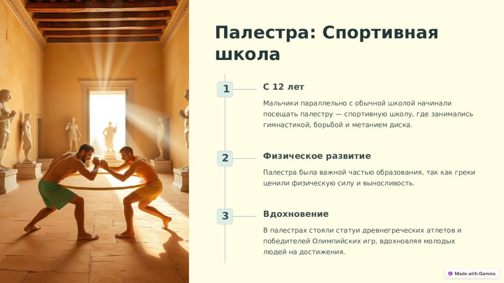Палестра: Спортивная школа 1 С 12 лет Мальчики параллельно с обычной школой начинали посещать палестру — спортивную школу, где занимались гимнастикой, борьбой и метанием диска. 2 Физическое развитие Палестра была важной частью образования, так как греки ценили физическую силу и выносливость. 3 Вдохновение В палестрах стояли статуи древнегреческих атлетов и победителей Олимпийских игр, вдохновляя молодых людей на достижения.