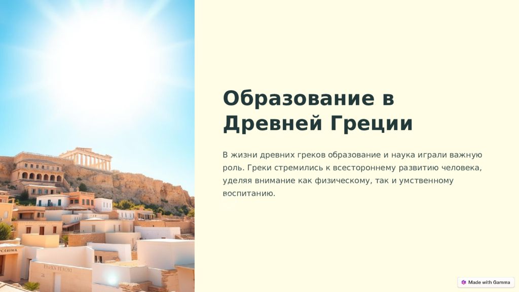 Образование в Древней Греции В жизни древних греков образование и наука играли важную роль. Греки стремились к всестороннему развитию человека, уделяя внимание как физическому, так и умственному воспитанию.
