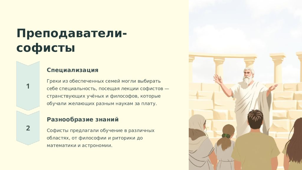 Преподаватели-софисты Специализация Греки из обеспеченных семей могли выбирать себе специальность, посещая лекции софистов — странствующих учёных и философов, которые обучали желающих разным наукам за плату. Разнообразие знаний Софисты предлагали обучение в различных областях, от философии и риторики до математики и астрономии.