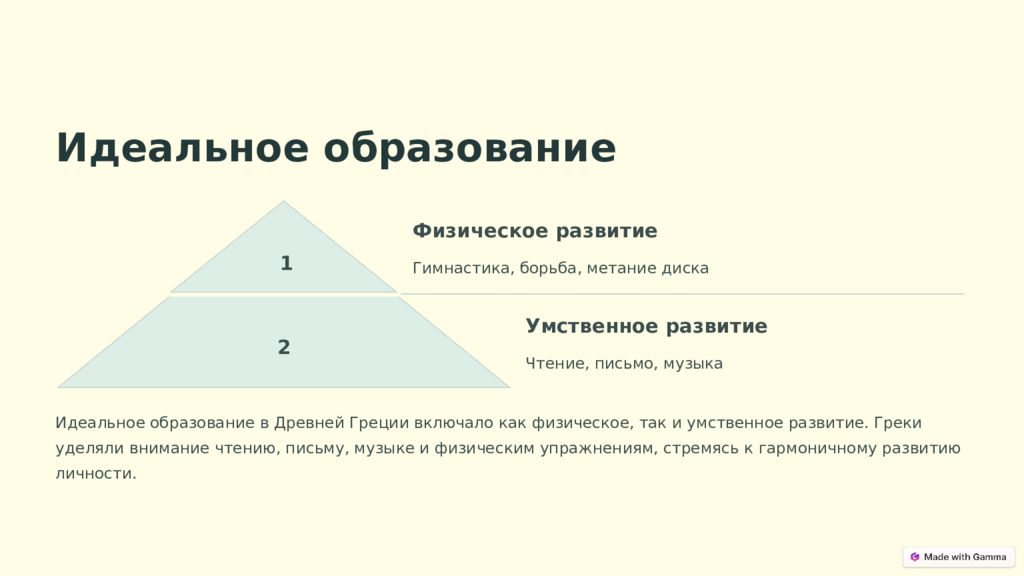 Идеальное образование 1 Физическое развитие Гимнастика, борьба, метание диска 2 Умственное развитие Чтение, письмо, музыка Идеальное образование в Древней Греции включало как физическое, так и умственное развитие. Греки уделяли внимание чтению, письму, музыке и физическим упражнениям, стремясь к гармоничному развитию личности.
