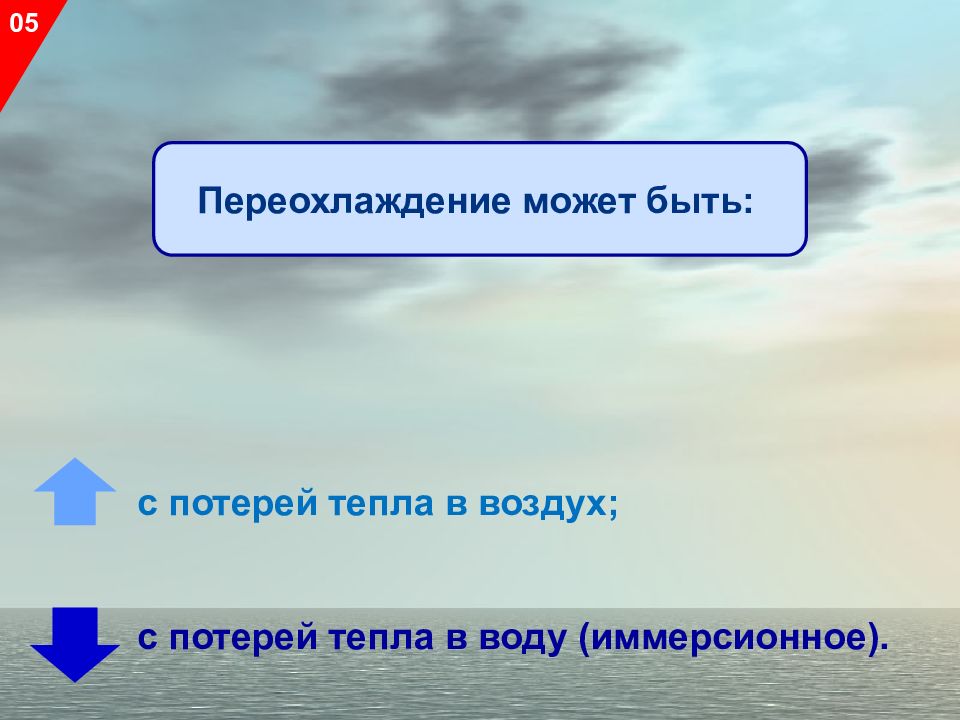Переохлаждение может быть: с потерей тепла в воздух; с потерей тепла в воду (иммерсионное). 0 5