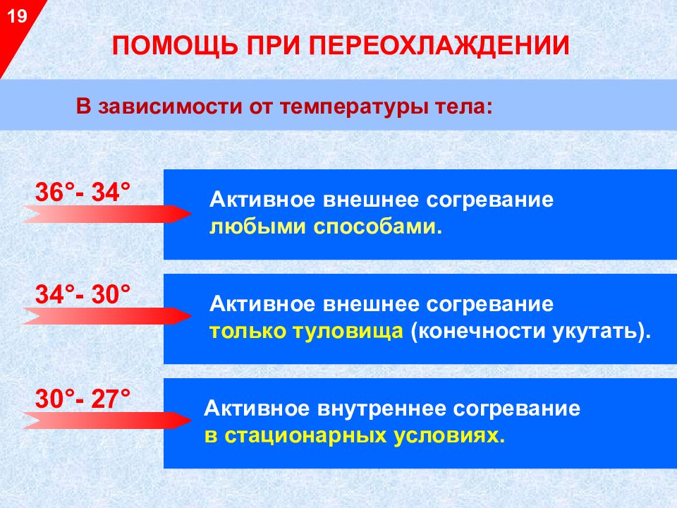 Для всех пострадавших: Перенести в тепло или, по крайней мере, укрыть от ветра. Сменить одежду на сухую и теплую или, по крайней мере, снять влажную одежду. Уложить горизонтально и запретить двигаться. Не массировать и не растирать! Возвышенное положение отмороженных конечностей. Контроль ректальной температуры. Контроль частоты пульса. 18 ПОМОЩЬ ПРИ ПЕРЕОХЛАЖДЕНИИ