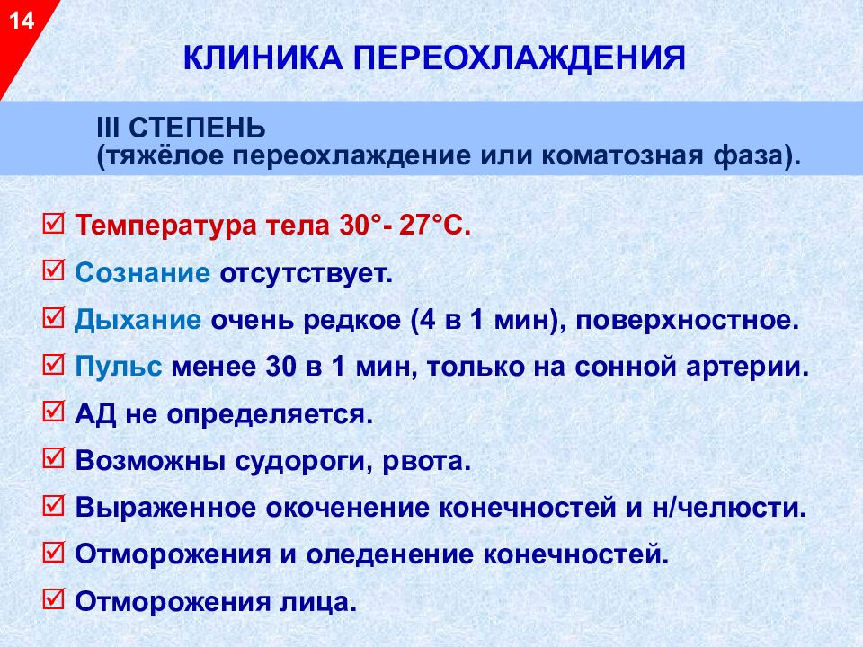 Температура тела 34°- 30°С. Прекращение мышечной дрожи. Нарастающая мышечная ригидность. Кожа холодная, с мраморным оттенком. Отморожения конечностей. Поверхностное, нерегулярное, редкое дыхание. Замедление сердечного ритма (50 - 30 в 1 мин). Пульс слабый, едва прощупывается. Падение артериального давления. Нарастающая сонливость. 13 КЛИНИКА ПЕРЕОХЛАЖДЕНИЯ I I СТЕПЕНЬ (среднее переохлаждение или фаза истощения).