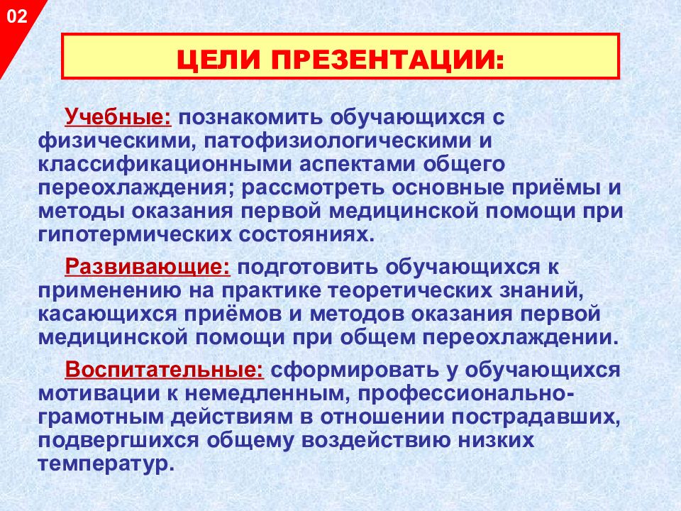 Учебные: познакомить обучающихся с физическими, патофизиологическими и классификационными аспектами общего переохлаждения; рассмотреть основные приёмы и методы оказания первой медицинской помощи при гипотермических состояниях. Развивающие: подготовить обучающихся к применению на практике теоретических знаний, касающихся приёмов и методов оказания первой медицинской помощи при общем переохлаждении. Воспитательные: сформировать у обучающихся мотивации к немедленным, профессионально-грамотным действиям в отношении пострадавших, подвергшихся общему воздействию низких температур. 0 2 ЦЕЛИ ПРЕЗЕНТАЦИИ: