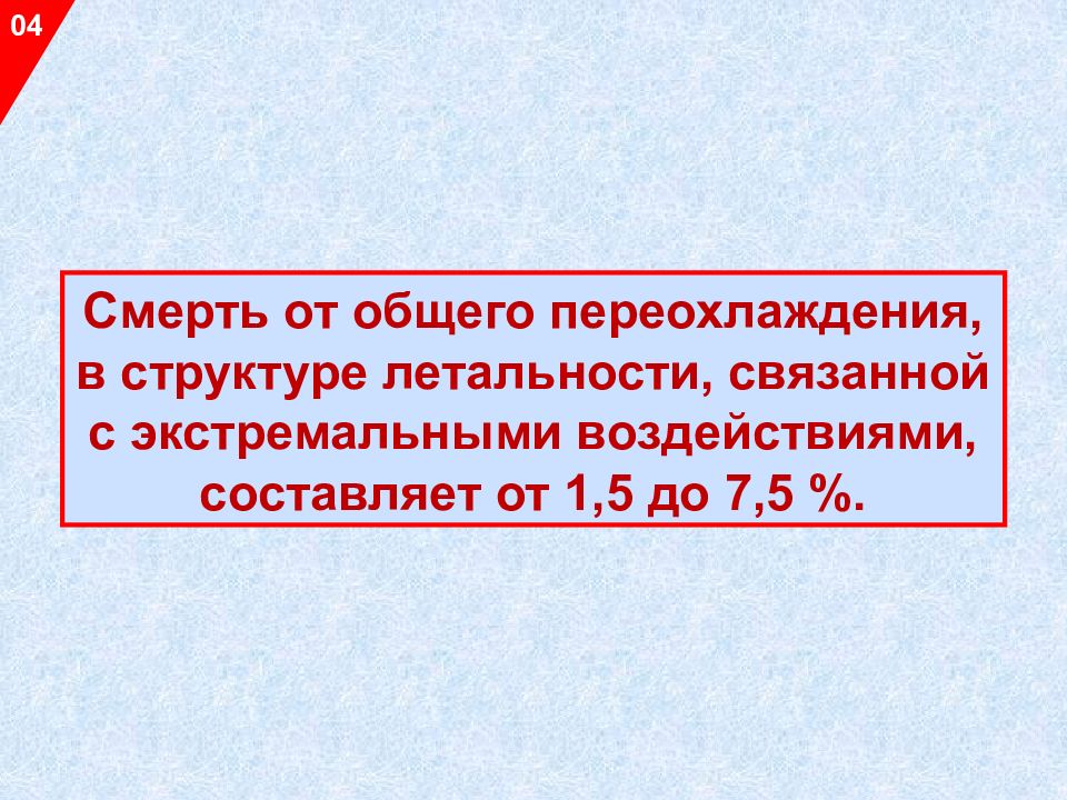 Смерть от общего переохлаждения, в структуре летальности, связанной с экстремальными воздействиями, составляет от 1,5 до 7,5 %. 0 4