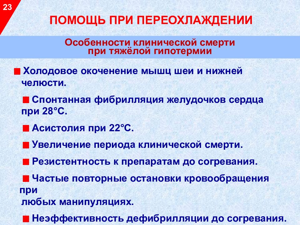 Холодовое окоченение мышц шеи и нижней челюсти. Спонтанная фибрилляция желудочков сердца при 28 ° С. Асистолия при 22 ° С. Увеличение периода клинической смерти. Резистентность к препаратам до согревания. Частые повторные остановки кровообращения при любых манипуляциях. Неэффективность дефибрилляции до согревания. 23 Особенности клинической смерти при тяжёлой гипотермии ПОМОЩЬ ПРИ ПЕРЕОХЛАЖДЕНИИ