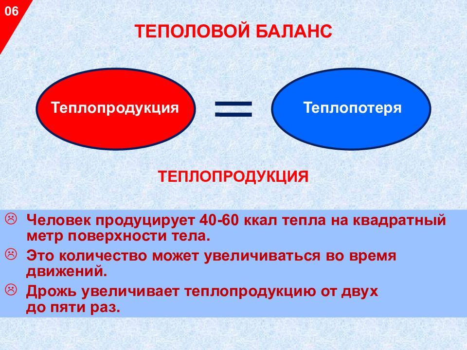 Человек продуцирует 40-60 ккал тепла на квадратный метр поверхности тела. Это количество может увеличиваться во время движений. Дрожь увеличивает теплопродукцию от двух до пяти раз. Теплопродукция Теплопотеря ТЕПЛОПРОДУКЦИЯ 0 6 ТЕПОЛОВОЙ БАЛАНС
