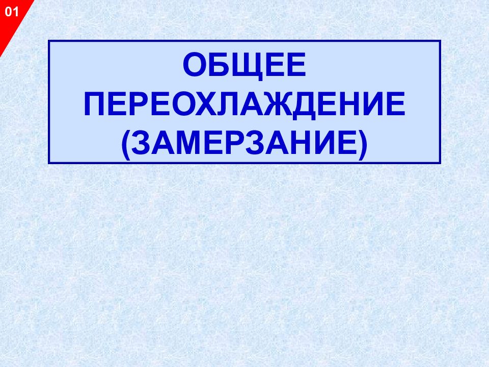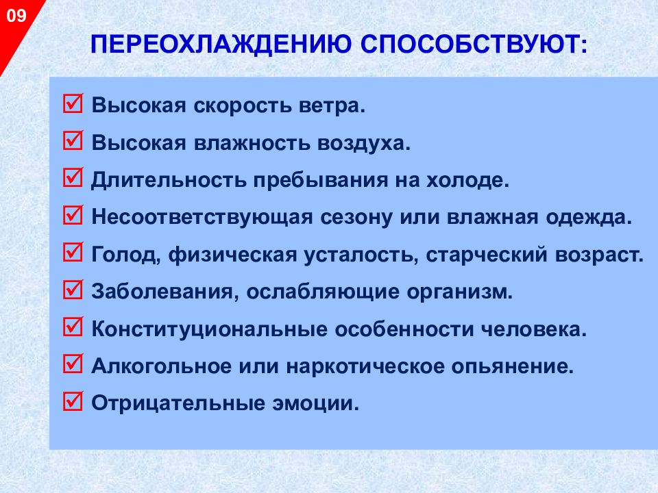 Высокая скорость ветра. Высокая влажность воздуха. Длительность пребывания на холоде. Несоответствующая сезону или влажная одежда. Голод, физическая усталость, старческий возраст. Заболевания, ослабляющие организм. Конституциональные особенности человека. Алкогольное или наркотическое опьянение. Отрицательные эмоции. 0 9 ПЕРЕОХЛАЖДЕНИЮ СПОСОБСТВУЮТ: