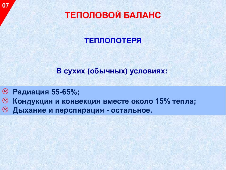 Радиация 55-65%; Кондукция и конвекция вместе около 15% тепла; Дыхание и перспирация - остальное. В сухих (обычных) условиях: ТЕПЛОПОТЕРЯ 0 7 ТЕПОЛОВОЙ БАЛАНС