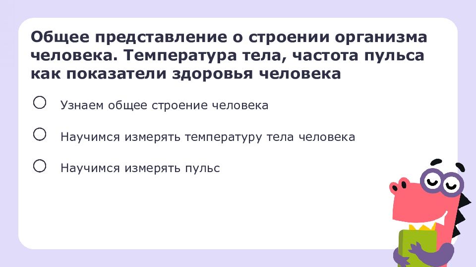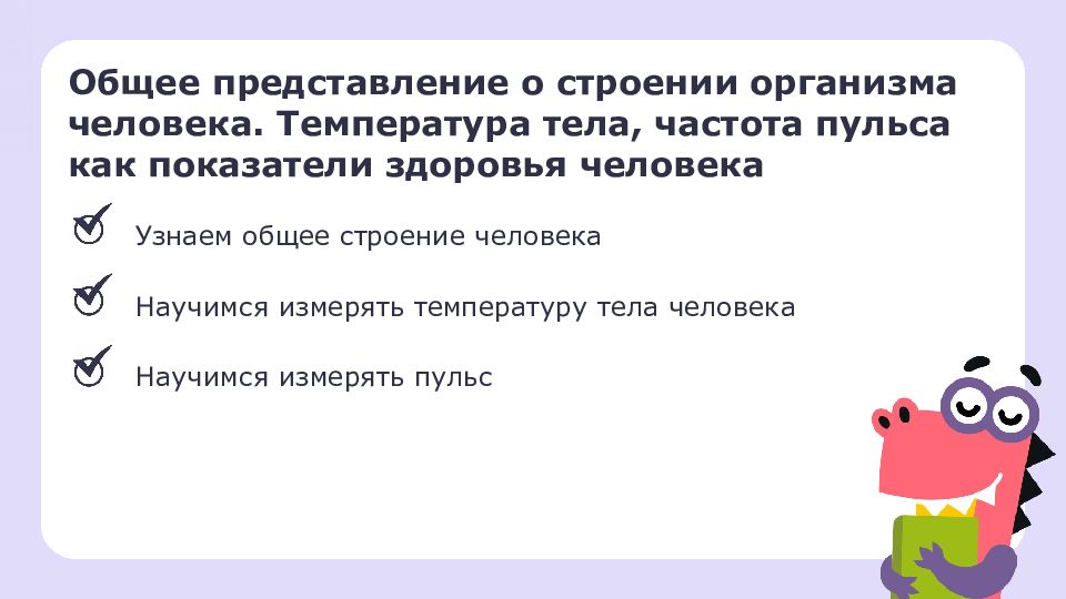 Общее представление о строении организма человека. Температура тела, частота пульса как показатели здоровья человека Узнаем общее строение человека Научимся измерять температуру тела человека Научимся измерять пульс