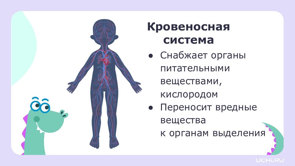 Кровеносная система Снабжает органы питательными веществами, кислородом Переносит вредные вещества к органам выделения
