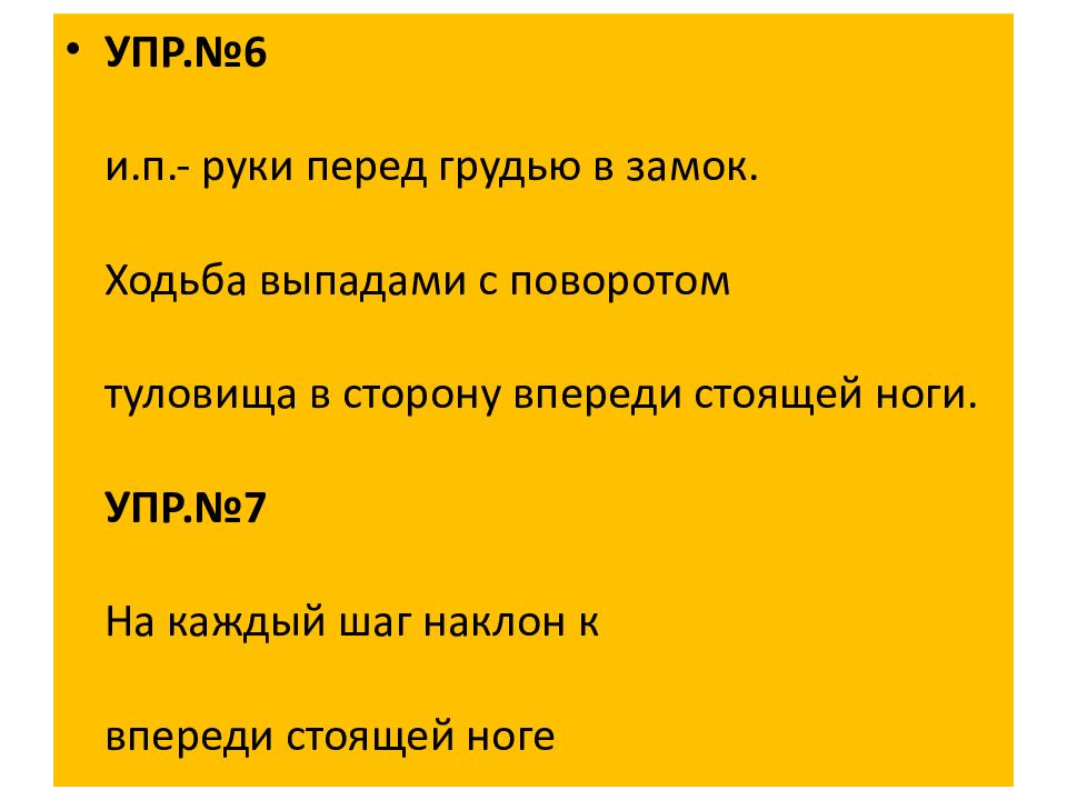 УПР.№6 и.п.- руки перед грудью в замок. Ходьба выпадами с поворотом туловища в сторону впереди стоящей ноги. УПР.№7 На каждый шаг наклон к впереди стоящей ноге