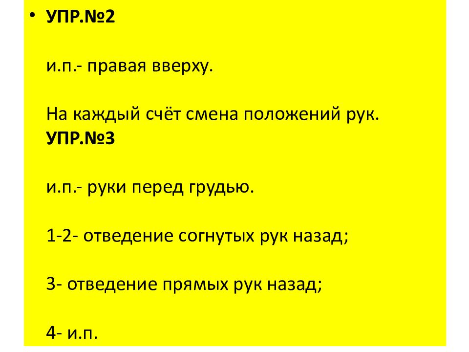 УПР.№2 и.п.- правая вверху. На каждый счёт смена положений рук. УПР.№3 и.п.- руки перед грудью. 1-2- отведение согнутых рук назад; 3- отведение прямых рук назад; 4- и.п.