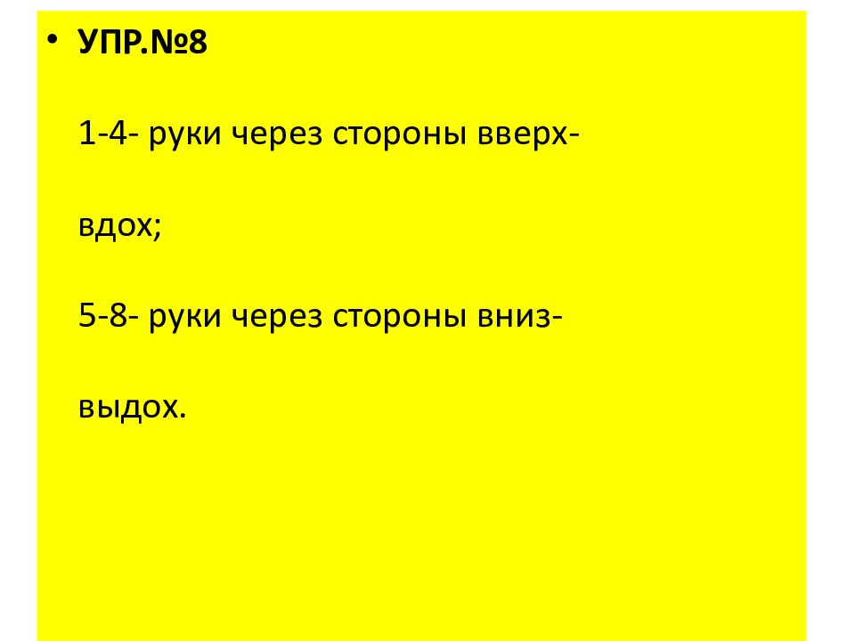 УПР.№8 1-4- руки через стороны вверх- вдох; 5-8- руки через стороны вниз- выдох.