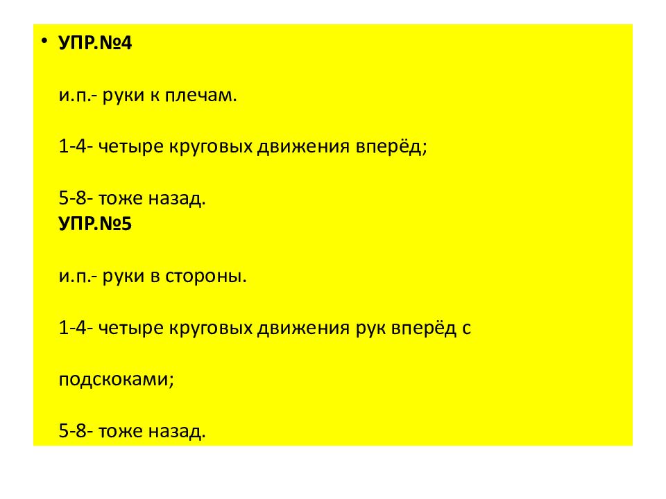 УПР.№4 и.п.- руки к плечам. 1-4- четыре круговых движения вперёд; 5-8- тоже назад. УПР.№5 и.п.- руки в стороны. 1-4- четыре круговых движения рук вперёд с подскоками; 5-8- тоже назад.