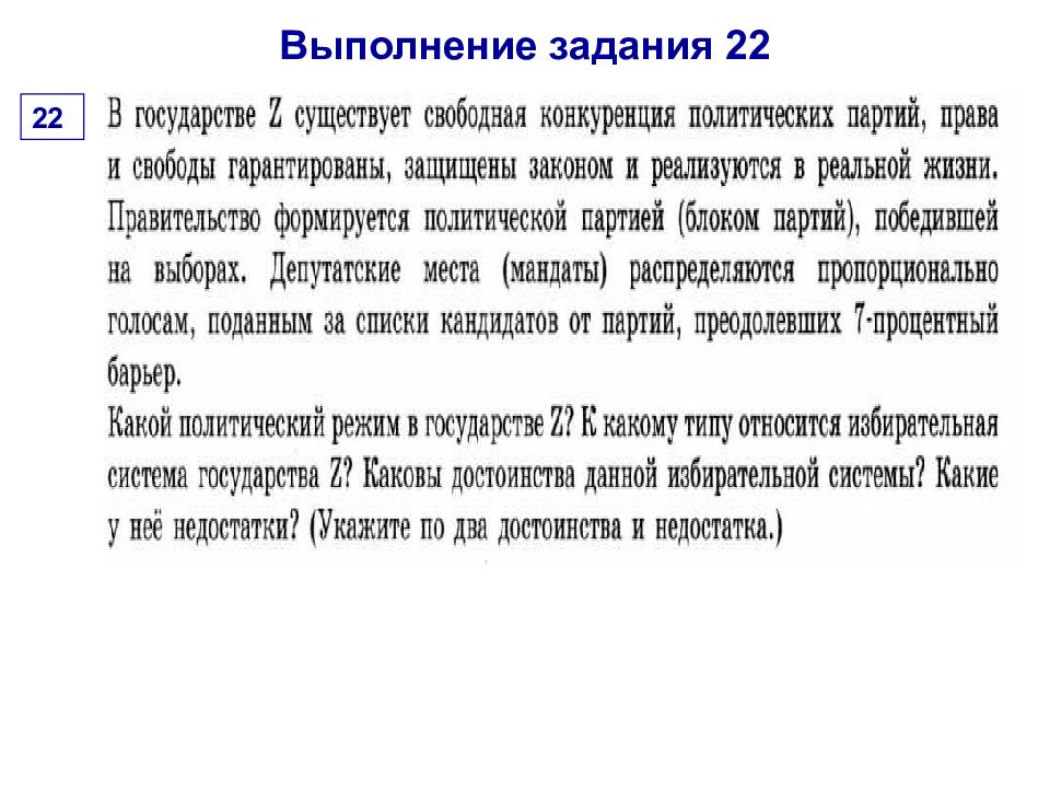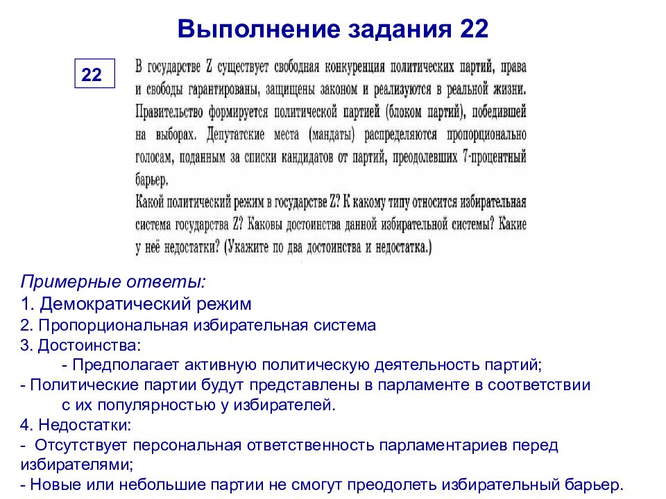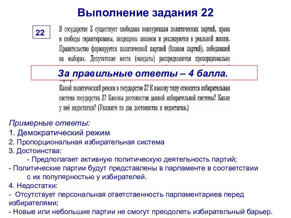 Выполнение задания 22 22 Примерные ответы: 1. Демократический режим 2. Пропорциональная избирательная система 3. Достоинства: - Предполагает активную политическую деятельность партий; - Политические партии будут представлены в парламенте в соответствии с их популярностью у избирателей. 4. Недостатки: - Отсутствует персональная ответственность парламентариев перед избирателями; - Новые или небольшие партии не смогут преодолеть избирательный барьер. За правильные ответы – 4 балла.