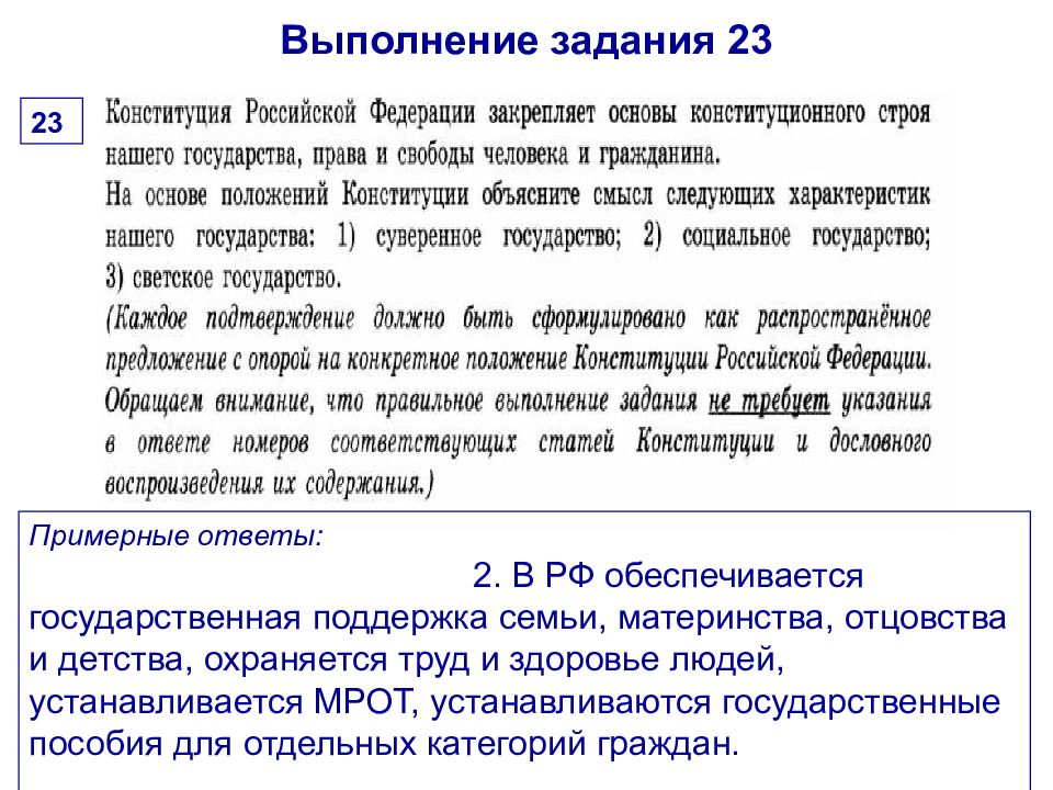Выполнение задания 23 23 Примерные ответы: 2. В РФ обеспечивается государственная поддержка семьи, материнства, отцовства и детства, охраняется труд и здоровье людей, устанавливается МРОТ, устанавливаются государственные пособия для отдельных категорий граждан.
