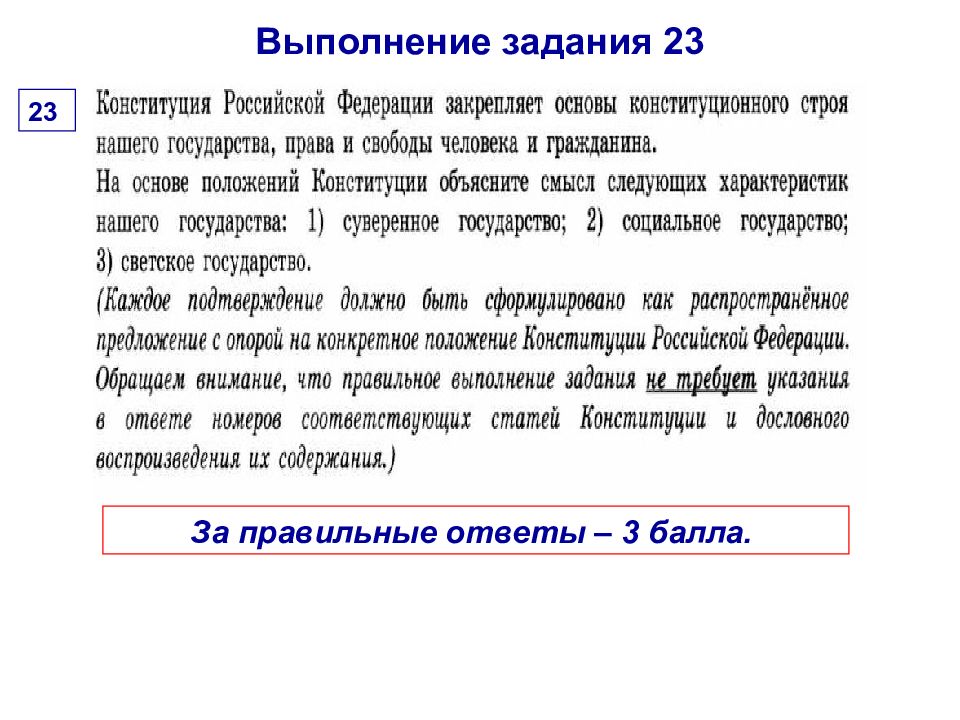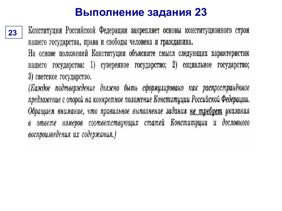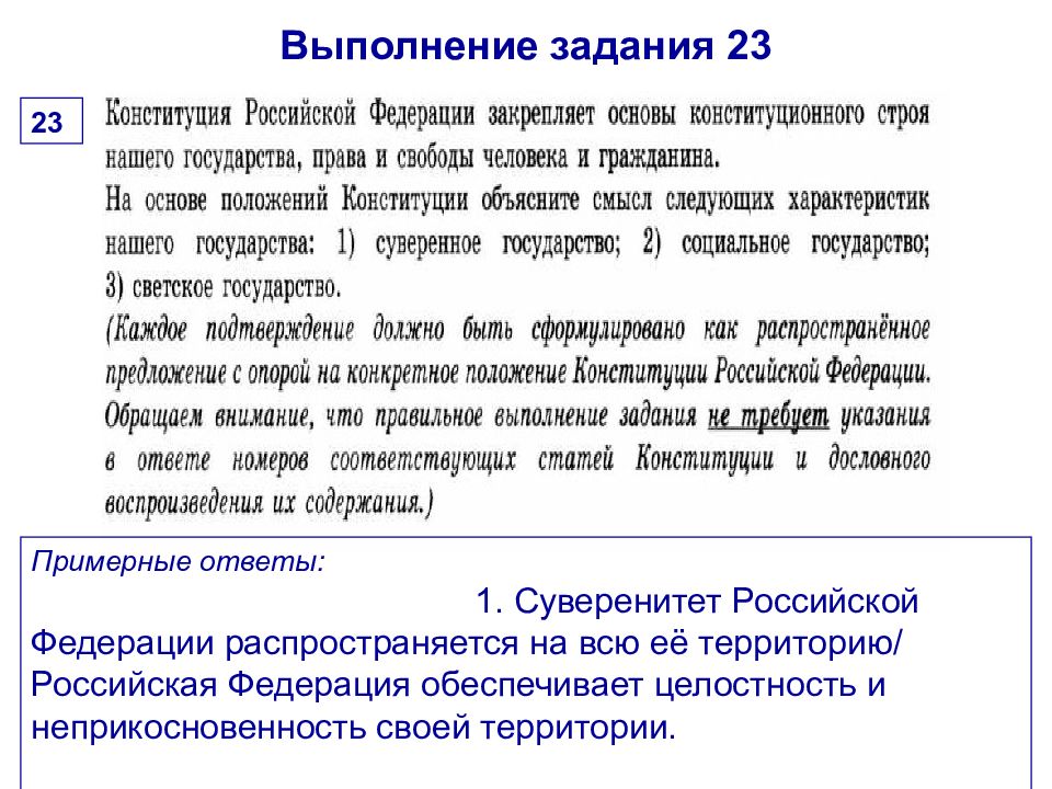 Выполнение задания 23 23 Примерные ответы: 1. Суверенитет Российской Федерации распространяется на всю её территорию/ Российская Федерация обеспечивает целостность и неприкосновенность своей территории.