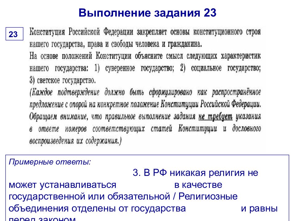 Выполнение задания 23 23 Примерные ответы: 3. В РФ никакая религия не может устанавливаться в качестве государственной или обязательной / Религиозные объединения отделены от государства и равны перед законом.