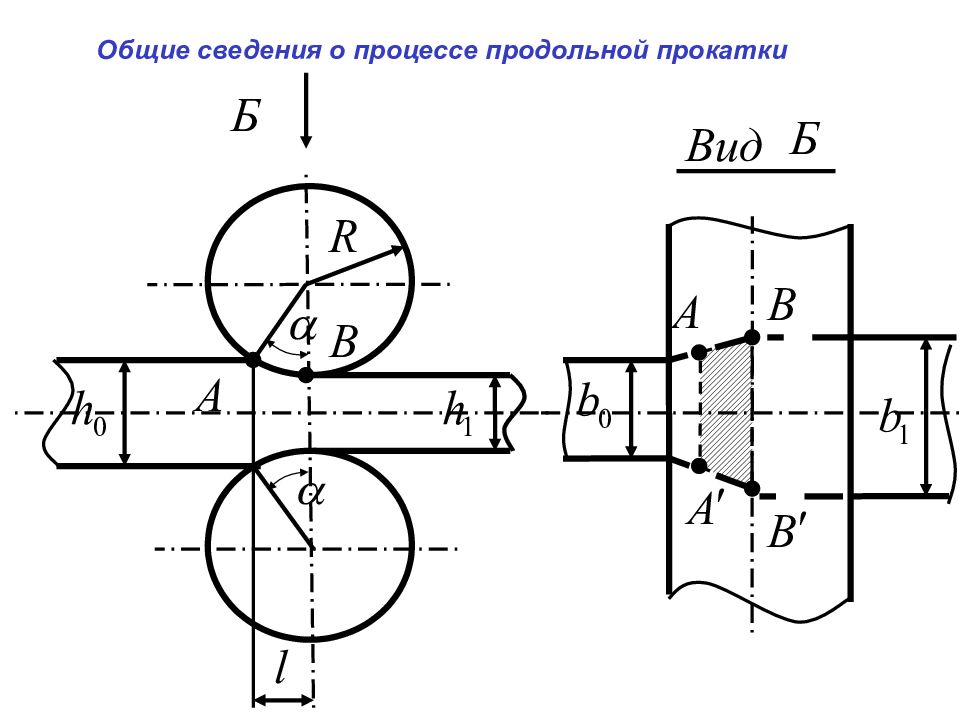 - Абсолютное обжатие - Уширение - Угол захвата - Длина дуги захвата - Уравнение Э. Зибеля - Площадь контакта металла с валком Основные геометрические параметры очага деформации :