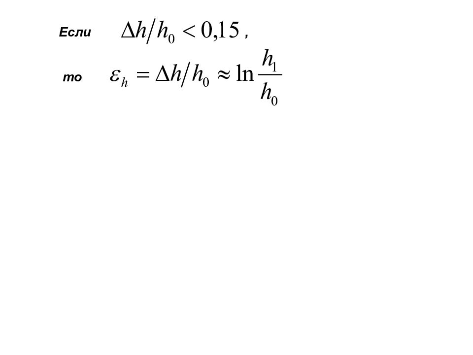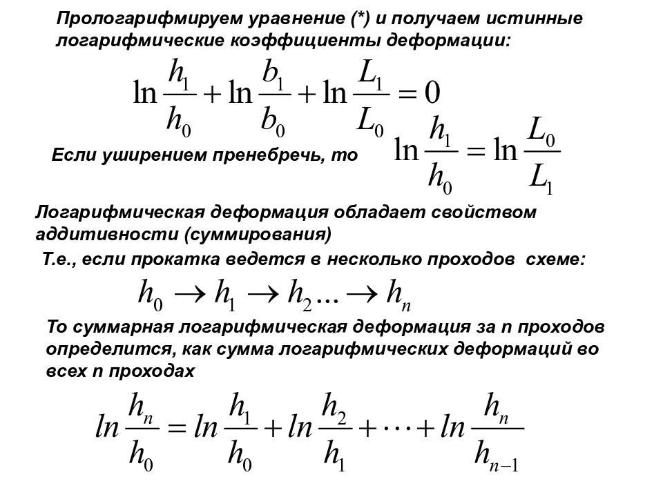 Если уширением пренебречь, то Логарифмическая деформация обладает свойством аддитивности ( суммирования ) Т.е., если прокатка ведется в несколько проходов схеме: То суммарная логарифмическая деформация за n проходов определится, как сумма логарифмических деформаций во всех n проходах Прологарифмируем уравнение (*) и получаем истинные логарифмические коэффициенты деформации: