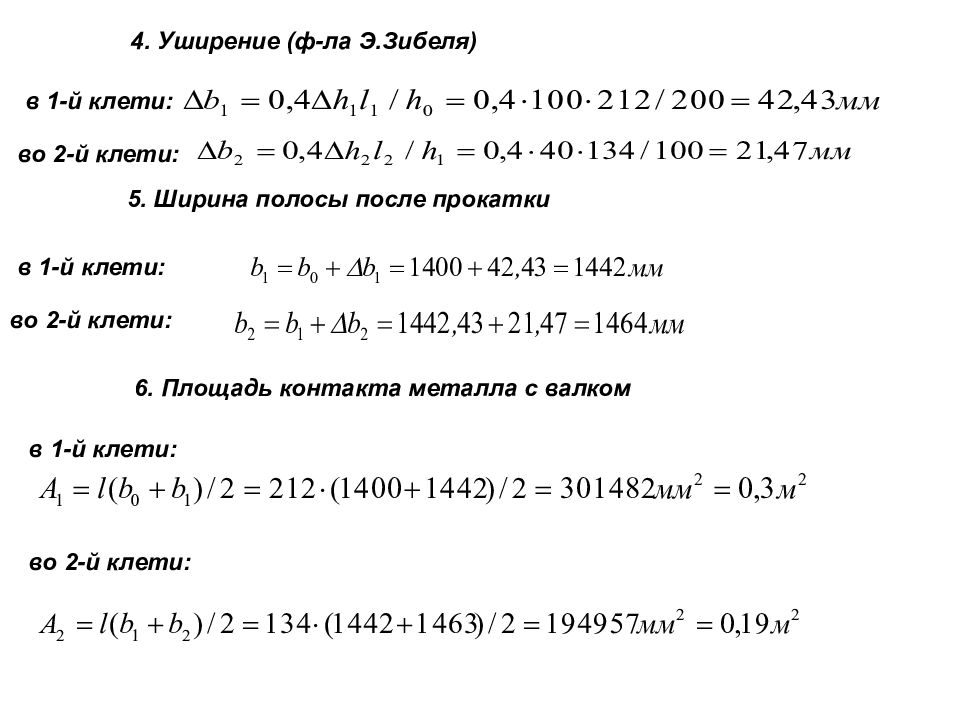 4. Уширение (ф-ла Э.Зибеля) в 1-й клети: во 2-й клети: 5. Ширина полосы после прокатки в 1-й клети: во 2-й клети: 6. Площадь контакта металла с валком в 1-й клети: во 2-й клети: