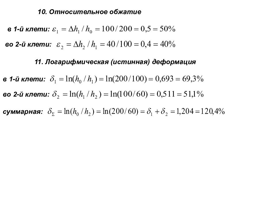 10. Относительное обжатие в 1-й клети: во 2-й клети: 11. Логарифмическая (истинная) деформация в 1-й клети: во 2-й клети: суммарная: