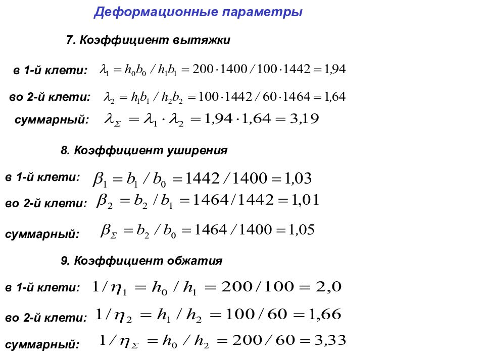 7. Коэффициент вытяжки в 1-й клети: во 2-й клети: 8. Коэффициент уширения в 1-й клети: во 2-й клети: 9. Коэффициент обжатия в 1-й клети: во 2-й клети: суммарный: суммарный: суммарный: Деформационные параметры