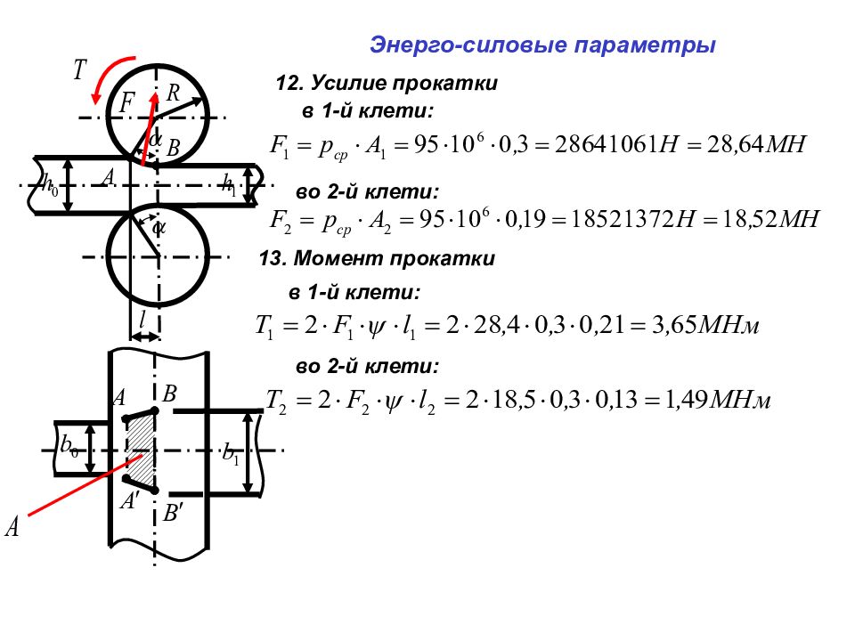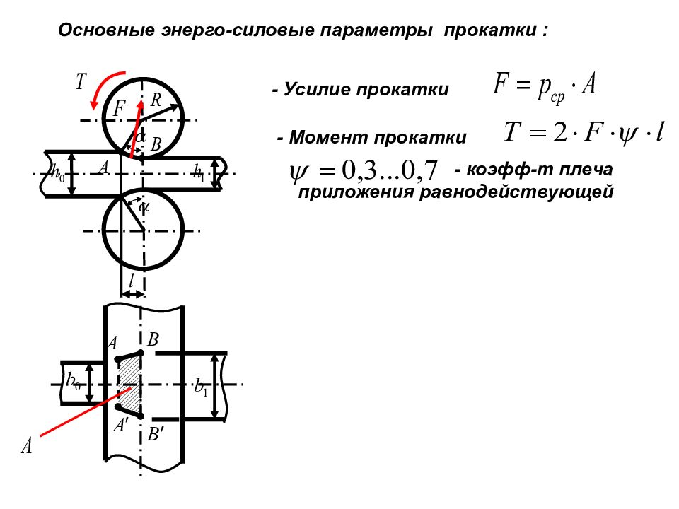 - Усилие прокатки - Момент прокатки Основные энерго-силовые параметры прокатки : - коэфф-т плеча приложения равнодействующей