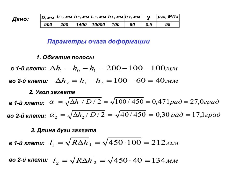 Дано: 1. Обжатие полосы в 1-й клети: во 2-й клети: 2. Угол захвата в 1-й клети: во 2-й клети: 3. Длина дуги захвата в 1-й клети: во 2-й клети: Параметры очага деформации