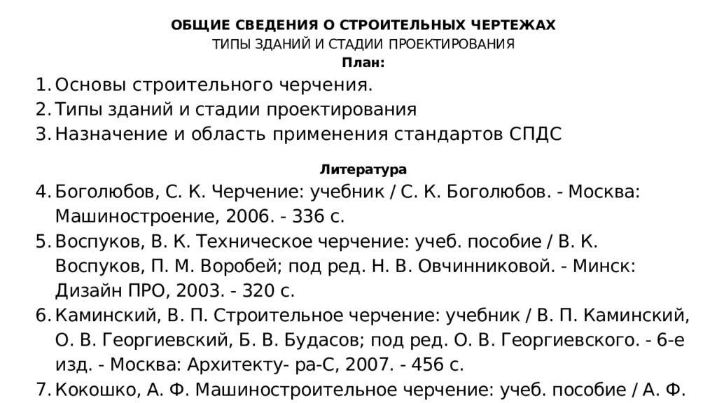ОБЩИЕ СВЕДЕНИЯ О СТРОИТЕЛЬНЫХ ЧЕРТЕЖАХ ТИПЫ ЗДАНИЙ И СТАДИИ ПРОЕКТИРОВАНИЯ План: Основы строительного черчения. Типы зданий и стадии проектирования Назначение и область применения стандартов СПДС Литература Боголюбов, С. К. Черчение: учебник / С. К. Боголюбов. - Москва: Машиностроение, 2006. - 336 с. Воспуков, В. К. Техническое черчение: учеб. пособие / В. К. Воспуков, П. М. Воробей; под ред. Н. В. Овчинниковой. - Минск: Дизайн ПРО, 2003. - 320 с. Каминский, В. П. Строительное черчение: учебник / В. П. Каминский, О. В. Георгиевский, Б. В. Будасов ; под ред. О. В. Георгиевского. - 6-е изд. - Москва: Архитекту - ра -С, 2007. - 456 с. Кокошко, А. Ф. Машиностроительное черчение: учеб. пособие / А. Ф. Кокошко, С. А. Матюх. - Минск: ИВЦ Минфина, 2012. - 552 с.