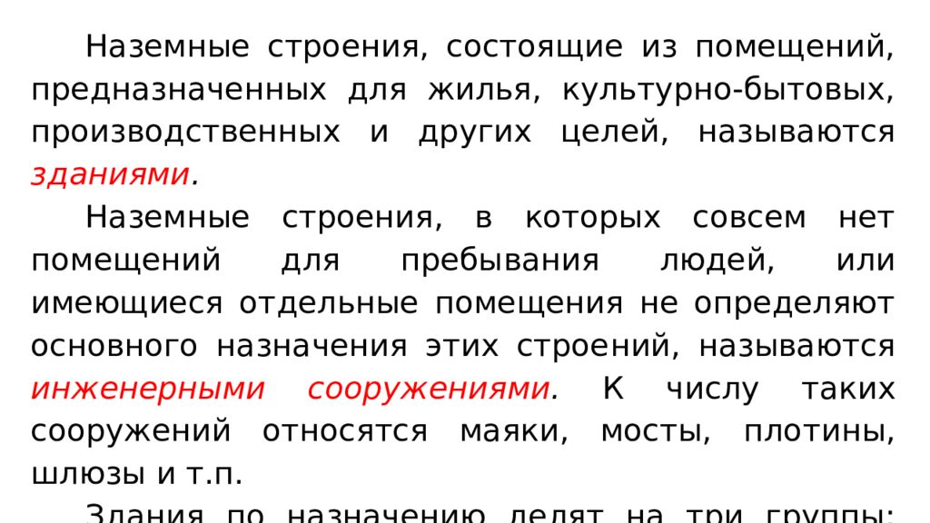 Наземные строения, состоящие из помещений, предназначенных для жилья, культурно-бытовых, производственных и других целей, называются зданиями. Наземные строения, в которых совсем нет помещений для пребывания людей, или имеющиеся отдельные помещения не определяют основного назначения этих строений, называются инженерными сооружениями. К числу таких сооружений относятся маяки, мосты, плотины, шлюзы и т.п. Здания по назначению делят на три группы: гражданские, промышленные и сельскохозяйственные.