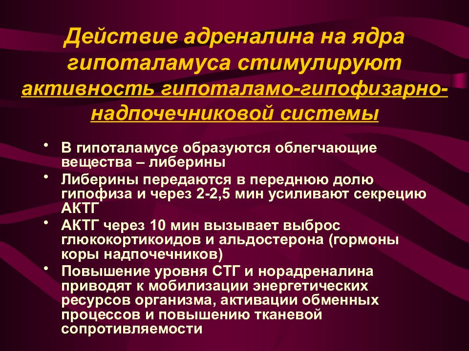 В гипоталамусе образуются облегчающие вещества – либерины Либерины передаются в переднюю долю гипофиза и через 2-2,5 мин усиливают секрецию АКТГ АКТГ через 10 мин вызывает выброс глюкокортикоидов и альдостерона (гормоны коры надпочечников) Повышение уровня СТГ и норадреналина приводят к мобилизации энергетических ресурсов организма, активации обменных процессов и повышению тканевой сопротивляемости