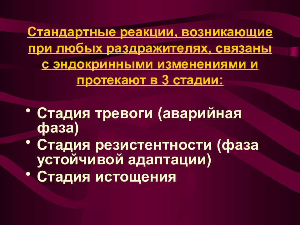 Слайд 9: Стандартные реакции, возникающие при любых раздражителях, связаны с эндокринными изменениями и протекают в 3 стадии:
