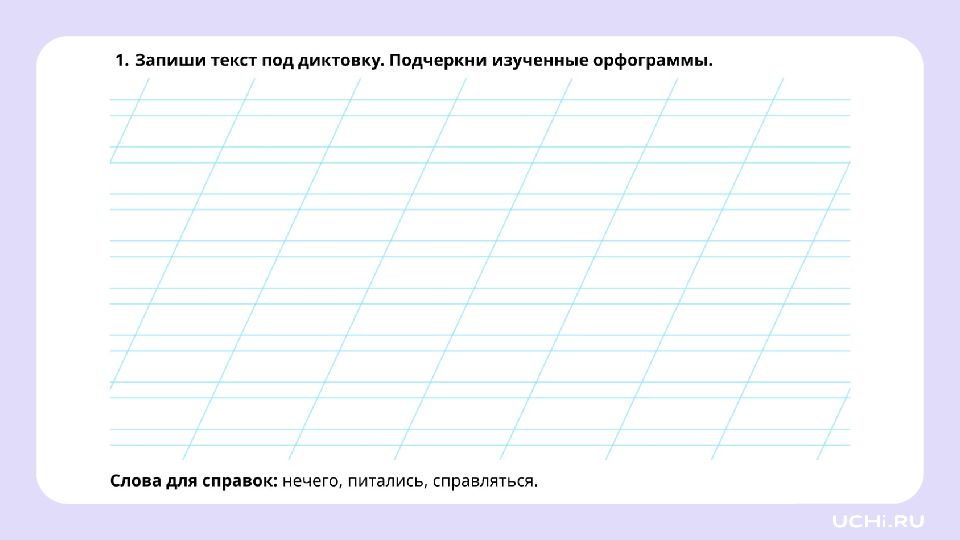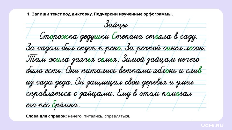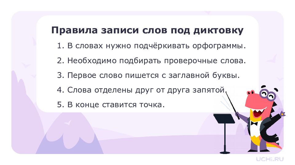 Правила записи слов под диктовку 1. В словах нужно подчёркивать орфограммы. 2. Необходимо подбирать проверочные слова. 3. Первое слово пишется с заглавной буквы. 4. Слова отделены друг от друга запятой. 5. В конце ставится точка.