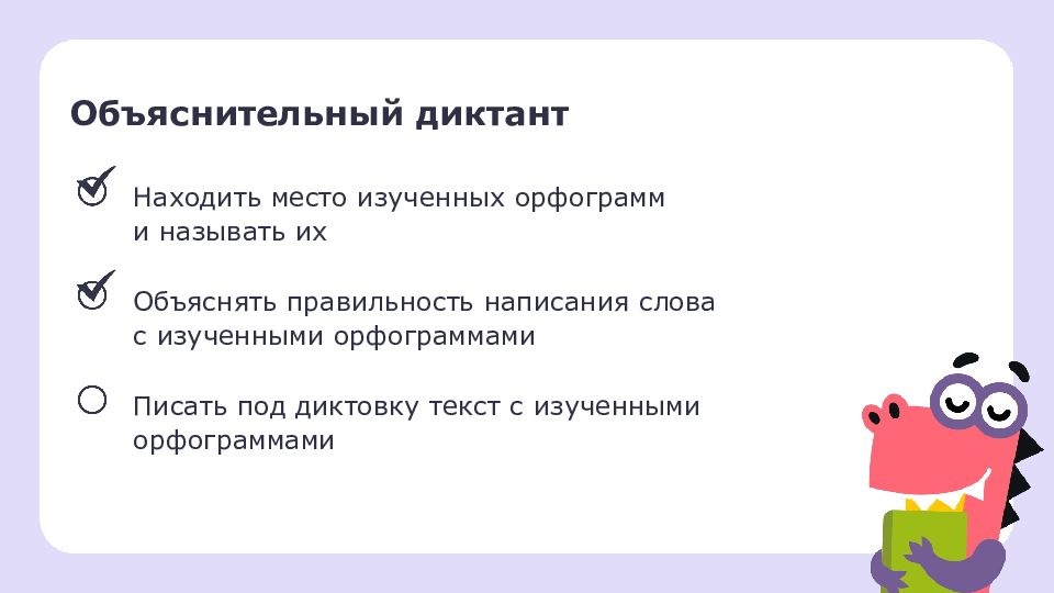 Объяснительный диктант Находить место изученных орфограмм и называть их Объяснять правильность написания слова с изученными орфограммами Писать под диктовку текст с изученными орфограммами