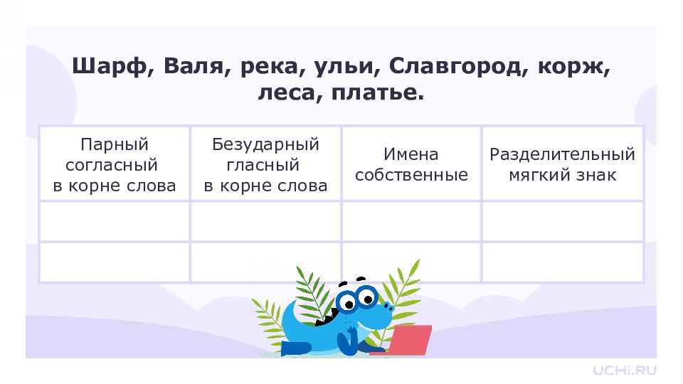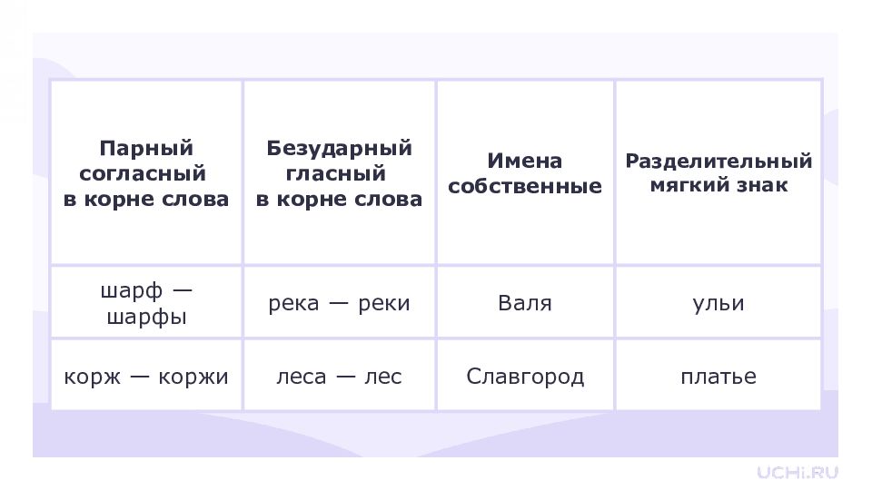 Парный согласный в корне слова Безударный гласный в корне слова Имена собственные Разделительный мягкий знак шарф — шарфы река — реки Валя ульи корж — коржи леса — лес Славгород платье
