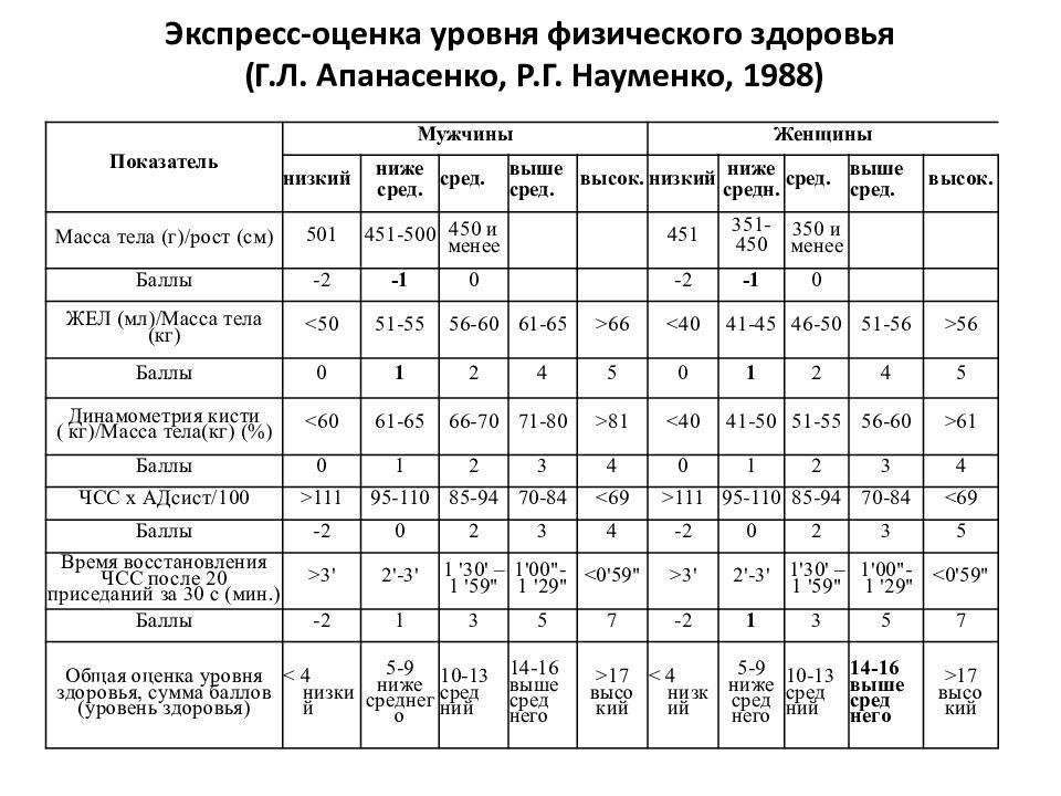 Показатель Мужчины Женщины низкий ниже сред. сред. выше сред. высок. низкий ниже средн. сред. выше сред. высок. Масса тела (г)/рост (см) 501 451-500 450 и менее 451 351- 450 350 и менее Баллы -2 -1 0 -2 -1 0 ЖЕЛ (мл)/Масса тела (кг) <50 51-55 56-60 61-65 >66 <40 41-45 46-50 51-56 >56 Баллы 0 1 2 4 5 0 1 2 4 5 Динамометрия кисти ( кг)/Масса тела(кг) (%) <60 61-65 66-70 71-80 >81 <40 41-50 51-55 56-60 >61 Баллы 0 1 2 3 4 0 1 2 3 4 ЧСС х АДсист /100 >111 95-110 85-94 70-84 <69 >111 95-110 85-94 70-84 <69 Баллы -2 0 2 3 4 -2 0 2 3 5 Время восстановления ЧСС после 20 приседаний за 30 с (мин.) >3' 2'-3' 1 '30' – 1 '59" 1'00"- 1 '29" <0'59" >3' 2'-3' 1'30' – 1 '59" 1'00"- 1 '29" <0'59" Баллы -2 1 3 5 7 -2 1 3 5 7 Общая оценка уровня здоровья, сумма баллов (уровень здоровья) < 4 низкий 5-9 ниже среднего 10-13 сред ний 14-16 выше сред него >17 высо кий < 4 низкий 5-9 ниже сред него 10-13 сред ний 14-16 выше сред него >17 высо кий