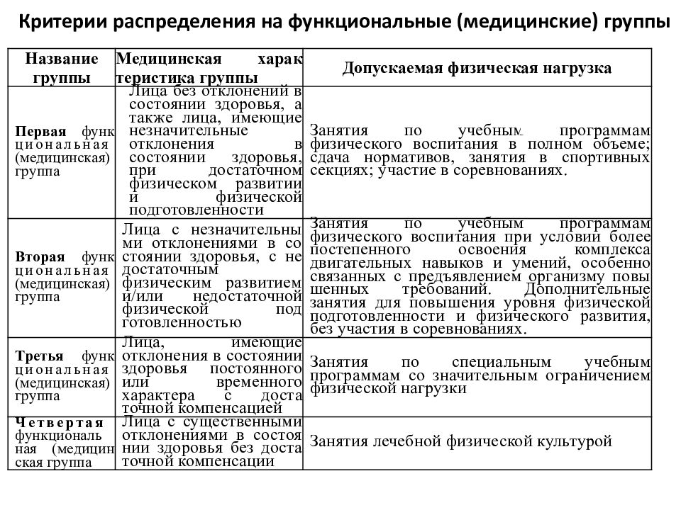 Критерии распределения на функциональные (медицинские) группы Название группы Медицинская характеристика группы Допускаемая физическая нагрузка Первая функ циональная (медицинская) группа Лица без отклонений в состоянии здоровья, а также лица, имеющие незначительные отклонения в состоянии здоровья, при достаточном физическом развитии и физической подготовленности Занятия по учебным программам физического воспитания в полном объеме; сдача нормативов, занятия в спортивных секциях; участие в соревнованиях. Вторая функ циональная (медицинская) группа Лица с незначительными отклонениями в состоянии здоровья, с недостаточным физическим развитием и/или недостаточной физической подготовленностью Занятия по учебным программам физического воспитания при условии более постепенного освоения комплекса двигательных навыков и умений, особенно связанных с предъявлением организму повышенных требований. Дополнительные занятия для повышения уровня физической подготовленности и физического развития, без участия в соревнованиях. Третья функ циональная (медицинская) группа Лица, имеющие отклонения в состоянии здоровья постоянного или временного характера с достаточной компенсацией Занятия по специальным учебным программам со значительным ограничением физической нагрузки Четвертая функциональная (медицинская группа Лица с существенными отклонениями в состоянии здоровья без достаточной компенсации Занятия лечебной физической культурой