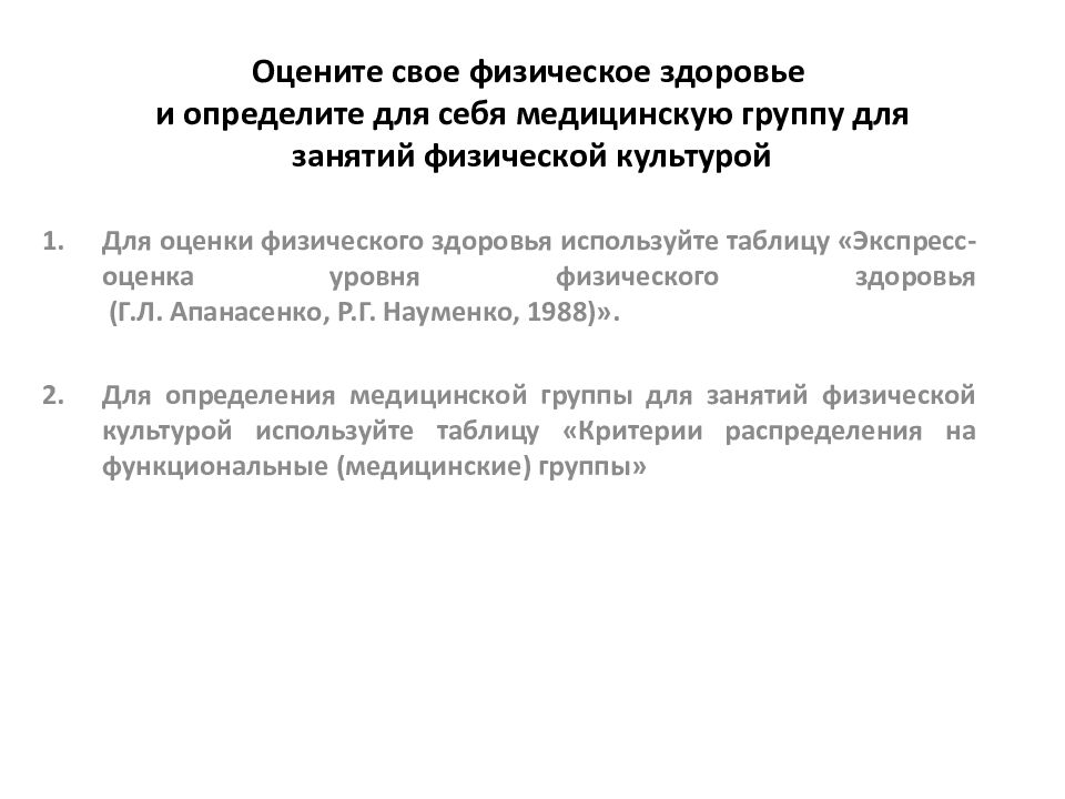 Для оценки физического здоровья используйте таблицу «Экспресс-оценка уровня физического здоровья (Г.Л. Апанасенко, Р.Г. Науменко, 1988)». Для определения медицинской группы для занятий физической культурой используйте таблицу «Критерии распределения на функциональные (медицинские) группы»