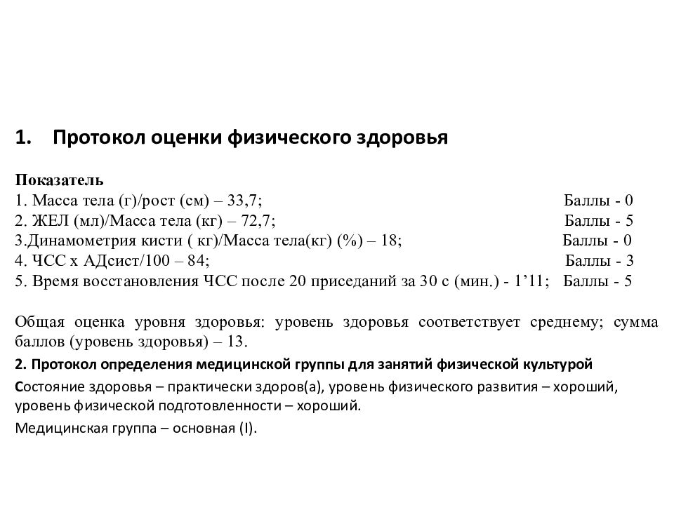 Протокол оценки физического здоровья Показатель 1. Масса тела (г)/рост (см) – 33,7 ; Баллы - 0 2. ЖЕЛ (мл)/Масса тела ( кг) – 72,7; Баллы - 5 3.Динамометрия кисти ( кг)/Масса тела(кг ) (%) – 18; Баллы - 0 4. ЧСС х АДсист /100 – 84; Баллы - 3 5. Время восстановления ЧСС после 20 приседаний за 30 с ( мин.) - 1’11; Баллы - 5 Общая оценка уровня здоровья: уровень здоровья соответствует среднему; сумма баллов (уровень здоровья) – 13. 2. Протокол определения медицинской группы для занятий физической культурой С остояние здоровья – практически здоров(а), уровень физического развития – хороший, уровень физической подготовленности – хороший. Медицинская группа – основная ( I).
