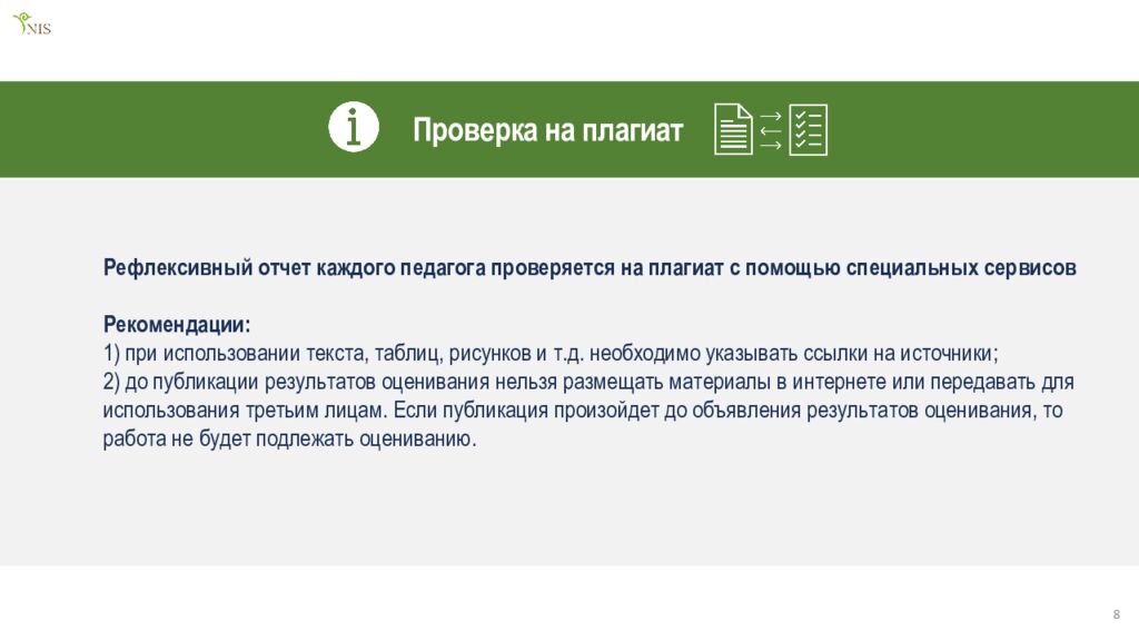 Проверка на плагиат Рефлексивный отчет каждого педагога проверяется на плагиат с помощью специальных сервисов Рекомендации: 1) при использовании текста, таблиц, рисунков и т.д. необходимо указывать ссылки на источники; 2) до публикации результатов оценивания нельзя размещать материалы в интернете или передавать для использования третьим лицам. Если публикация произойдет до объявления результатов оценивания, то работа не будет подлежать оцениванию. 8