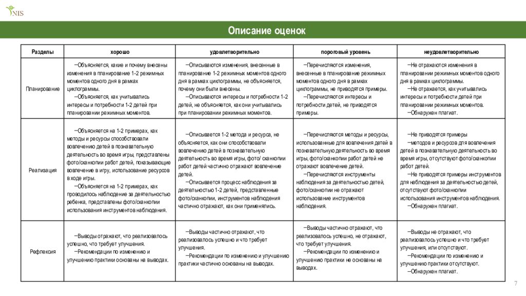 7 Описание оценок Разделы хорошо удовлетворительно пороговый уровень неудовлетворительно Планирование Объясняется, какие и почему внесены изменения в планирование 1-2 режимных моментов одного дня в рамках циклограммы. Объясняется, как учитывались интересы и потребности 1-2 детей при планировании режимных моментов. Описываются изменения, внесенные в планирование 1-2 режимных моментов одного дня в рамках циклограммы, не объясняется, почему они были внесены. Описываются интересы и потребности 1-2 детей, не объясняется, как они учитывались при планировании режимных моментов. Перечисляются изменения, внесенные в планирование режимных моментов одного дня в рамках циклограммы, не приводятся примеры. Перечисляются интересы и потребности детей, не приводятся примеры. Не отражаются изменения в планировании режимных моментов одного дня в рамках циклограммы. Не отражается, как учитывались интересы и потребности детей при планировании режимных моментов. Обнаружен плагиат. Реализация Объясняется на 1-2 примерах, как методы и ресурсы способствовали вовлечению детей в познавательную деятельность во время игры, представлены фото/ сканкопии работ детей, показывающие вовлечение в игру, использование ресурсов в ходе игры. Объясняется на 1-2 примерах, как проводилось наблюдение за деятельностью ребенка, представлены фото/ сканкопии использования инструментов наблюдения. Описывается 1-2 метода и ресурса, не объясняется, как они способствовали вовлечению детей в познавательную деятельность во время игры, фото/ сканкопии работ детей частично отражают вовлечение детей. Описывается процесс наблюдения за деятельностью 1-2 детей, представленные фото/ сканкопии, инструментов наблюдения частично отражают, как они применялись. Перечисляются методы и ресурсы, использованные для вовлечения детей в познавательную деятельность во время игры, фото/ сканкопии работ детей не отражают вовлечение детей. Перечисляются инструменты наблюдения за деятельностью детей, фото/ сканкопии не отражают использование инструментов наблюдения. Не приводятся примеры методов и ресурсов для вовлечения детей в познавательную деятельность во время игры, отсутствуют фото/ сканкопии работ детей. Не приводятся примеры инструментов для наблюдения за деятельностью детей, отсутствуют фото/ сканкопии использования инструментов наблюдения. Обнаружен плагиат. Рефлексия Выводы отражают, что реализовалось успешно, что требует улучшения. Рекомендации по изменению и улучшению практики основаны на выводах. Выводы частично отражают, что реализовалось успешно и что требует улучшения. Рекомендации по изменению и улучшению практики частично основаны на выводах. Выводы частично отражают, что реализовалось успешно, не отражают, что требует улучшения. Рекомендации по изменению и улучшению практики не основаны на выводах. Выводы не отражают, что реализовалось успешно и что требует улучшения, или отсутствуют. Рекомендации по изменению и улучшению практики отсутствуют. Обнаружен плагиат.