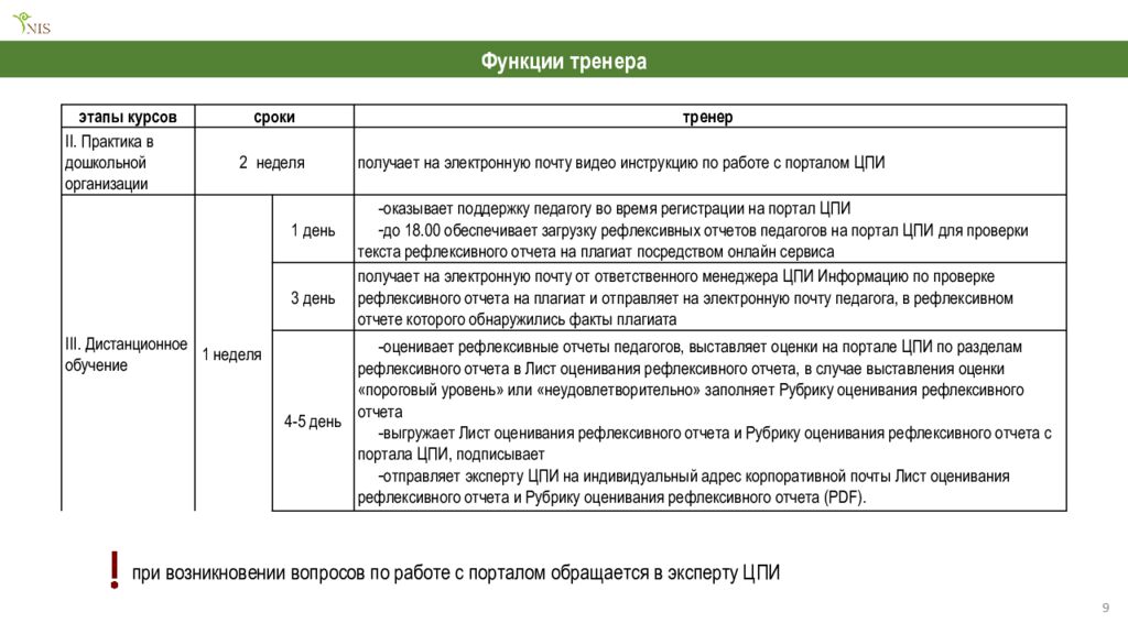 Функции тренера этапы курсов сроки тренер II. Практика в дошкольной организации 2 неделя получает на электронную почту видео инструкцию по работе с порталом ЦПИ III. Дистанционное обучение 1 неделя 1 день оказывает поддержку педагогу во время регистрации на портал ЦПИ до 18.00 обеспечивает загрузку рефлексивных отчетов педагогов на портал ЦПИ для проверки текста рефлексивного отчета на плагиат посредством онлайн сервиса 3 день получает на электронную почту от ответственного менеджера ЦПИ Информацию по проверке рефлексивного отчета на плагиат и отправляет на электронную почту педагога, в рефлексивном отчете которого обнаружились факты плагиата 4-5 день оценивает рефлексивные отчеты педагогов, выставляет оценки на портале ЦПИ по разделам рефлексивного отчета в Лист оценивания рефлексивного отчета, в случае выставления оценки «пороговый уровень» или «неудовлетворительно» заполняет Рубрику оценивания рефлексивного отчета выгружает Лист оценивания рефлексивного отчета и Рубрику оценивания рефлексивного отчета с портала ЦПИ, подписывает отправляет эксперту ЦПИ на индивидуальный адрес корпоративной почты Лист оценивания рефлексивного отчета и Рубрику оценивания рефлексивного отчета (PDF). при возникновении вопросов по работе с порталом обращается в эксперту ЦПИ 9