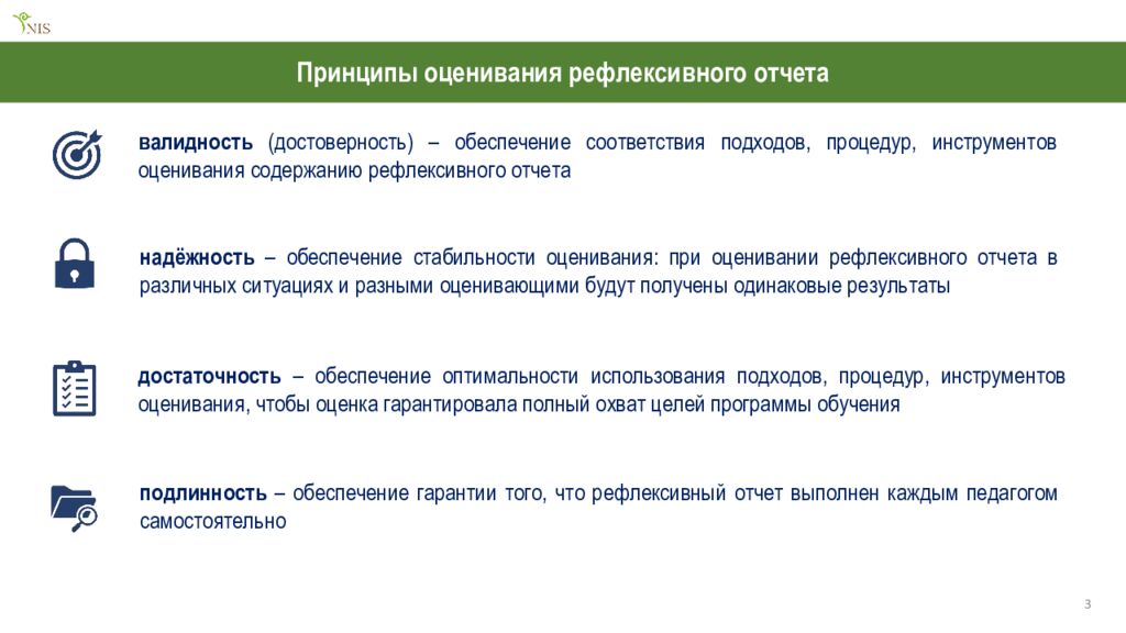 3 валидность (достоверность) – обеспечение соответствия подходов, процедур, инструментов оценивания содержанию рефлексивного отчета надёжность – обеспечение стабильности оценивания: при оценивании рефлексивного отчета в различных ситуациях и разными оценивающими будут получены одинаковые результаты достаточность – обеспечение оптимальности использования подходов, процедур, инструментов оценивания, чтобы оценка гарантировала полный охват целей программы обучения подлинность – обеспечение гарантии того, что рефлексивный отчет выполнен каждым педагогом самостоятельно