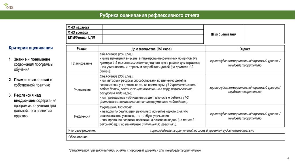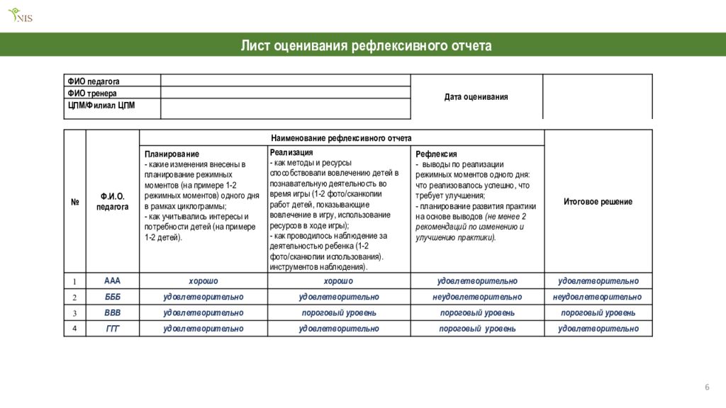 6 ФИО педагога Дата оценивания ФИО тренера ЦПМ/Филиал ЦПМ № Ф.И.О. педагога Наименование рефлексивного отчета Итоговое решение Планирование - какие изменения внесены в планирование режимных моментов (на примере 1-2 режимных моментов) одного дня в рамках циклограммы; - как учитывались интересы и потребности детей (на примере 1-2 детей). Реализация - как методы и ресурсы способствовали вовлечению детей в познавательную деятельность во время игры (1-2 фото/ сканкопии работ детей, показывающие вовлечение в игру, использование ресурсов в ходе игры); - как проводилось наблюдение за деятельностью ребенка (1-2 фото/ сканкопии использования). инструментов наблюдения). Рефлексия - выводы по реализации режимных моментов одного дня: что реализовалось успешно, что требует улучшения; - планирование развития практики на основе выводов (не менее 2 рекомендаций по изменению и улучшению практики). 1 ААА хорошо хорошо удовлетворительно удовлетворительно 2 БББ удовлетворительно удовлетворительно неудовлетворительно неудовлетворительно 3 ВВВ удовлетворительно пороговый уровень пороговый уровень пороговый уровень 4 ГГГ удовлетворительно удовлетворительно пороговый уровень удовлетворительно Лист оценивания рефлексивного отчета