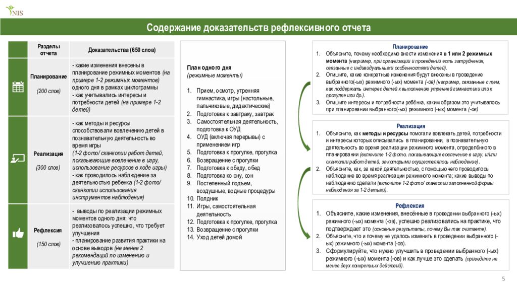 Разделы отчета Доказательства (650 слов) Планирование (200 слов) - какие изменения внесены в планирование режимных моментов (на примере 1-2 режимных моментов) одного дня в рамках циклограммы - как учитывались интересы и потребности детей (на примере 1-2 детей) Реализация (300 слов) - как методы и ресурсы способствовали вовлечению детей в познавательную деятельность во время игры (1-2 фото/ сканкопии работ детей, показывающие вовлечение в игру, использование ресурсов в ходе игры) - как проводилось наблюдение за деятельностью ребенка (1-2 фото/ сканкопии использования инструментов наблюдения) Рефлексия (150 слов) - выводы по реализации режимных моментов одного дня: что реализовалось успешно, что требует улучшения - планирование развития практики на основе выводов (не менее 2 рекомендаций по изменению и улучшению практики) 5 Содержание доказательств рефлексивного отчета План одного дня (режимные моменты) Прием, осмотр, утренняя гимнастика, игры (настольные, пальчиковые, дидактические) Подготовка к завтраку, завтрак Самостоятельная деятельность, подготовка к ОУД ОУД (включая перерывы) с применением игр Подготовка к прогулке, прогулка Возвращение с прогулки Подготовка к обеду, обед Подготовка ко сну, сон Постепенный подъем, воздушные, водные процедуры Полдник Игры, самостоятельная деятельность Подготовка к прогулке, прогулка Возвращение с прогулки Уход детей домой Планирование Объясните, почему необходимо внести изменения в 1 или 2 режимных момента (например, при организации и проведении есть затруднения, связанные с индивидуальными особенностями детей). Опишите, какие конкретные изменения будут внесены в проведение выбранного(-ых) режимного (-ых) момента (- ов ) (например, связанные с тем, как поддержать интерес детей к выполнению утренней гимнастики или к прогулке или др.). Опишите интересы и потребности ребёнка, каким образом это учитывалось при планировании выбранного(-ых) режимного (-ых) момента (- ов ) Реализация Объясните, как методы и ресурсы помогали вовлекать детей, потребности и интересы которых описывались в планировании, в познавательную деятельность во время реализации режимного момента, определённого в планировании (включите 1-2 фото, показывающие вовлечение в игру, и/или сканкопии работ детей, за которыми осуществлялось наблюдение). Объясните, как, за какой деятельностью, с помощью чего проводилось наблюдение во время реализации режимного момента; какие выводы по наблюдению сделали (включите 1-2 фото/ сканкопии заполненной формы наблюдения за 1-2 детьми). Рефлексия Объясните, какие изменения, внесённые в проведении выбранного (-ых) режимного (-ых) момента (- ов ), успешно реализовались на практике, что подтверждает это (основные результаты, почему Вы так считаете). Объясните, что и почему не удалось изменить в проведении выбранного (-ых) режимного (-ых) момента (- ов ). Сформулируйте, что нужно улучшить в проведении выбранного (-ых) режимного (-ых) момента (- ов ) и как лучше это сделать (приведите не менее двух конкретных действий).